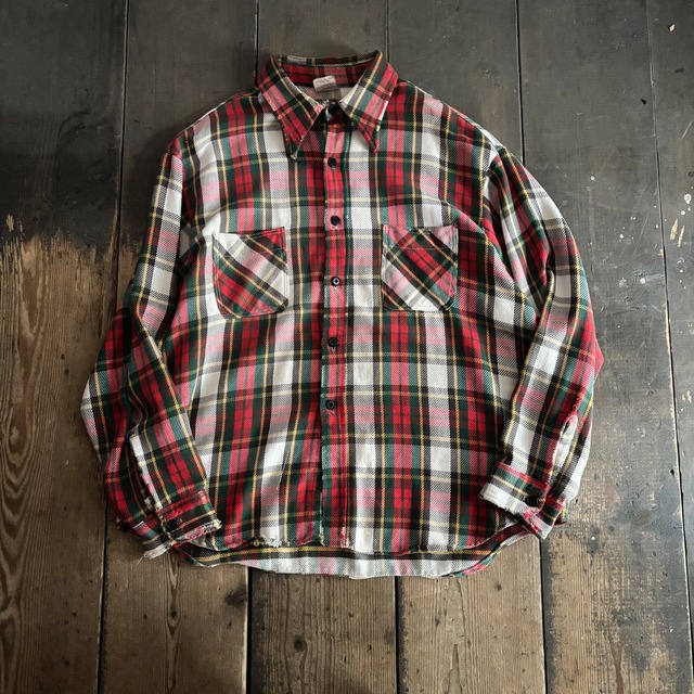 70s BIG MAC heavy flannel shirt ヘビネルといえばBIG MAC いいダメージの入った 70年代のヘビーネルシャツ。 レッド、グリーン、イエローに白黒を加え、多色使いされていますが、しっくりとくる着やすいカラーリング 襟、裾、袖口などにダメージが入りそれもまたいい雰囲気になっています。 sizeもXLと大きめで身幅、着丈のバランスもいいですので、一枚でも、インナーや、 スウェット、パーカー上から着用もできるサイズ感です。 made in: USA color: red,green,yellow,white material:100 % cotton SIZE: XL • 着丈:68cm • 身幅:72cm • 肩幅:56cm • 袖丈(肩〜袖):61cm (脇〜袖):52cm model: 165cm 【状態】 袖口、襟元、脇などにダメージありますが、大きな穴等なく、まだまだ着用していただけるコンディションです。 ヴィンテージ・古着にご理解のある方におすすめいたします。 【注意事項】 当店の商品はすべてUSEDアイテムのため、返品は不可とさせていただきます。 ダメージや汚れなど、画像で確認できない箇所がある場合もございます。ご不明点はご購入前にお問い合わせください。