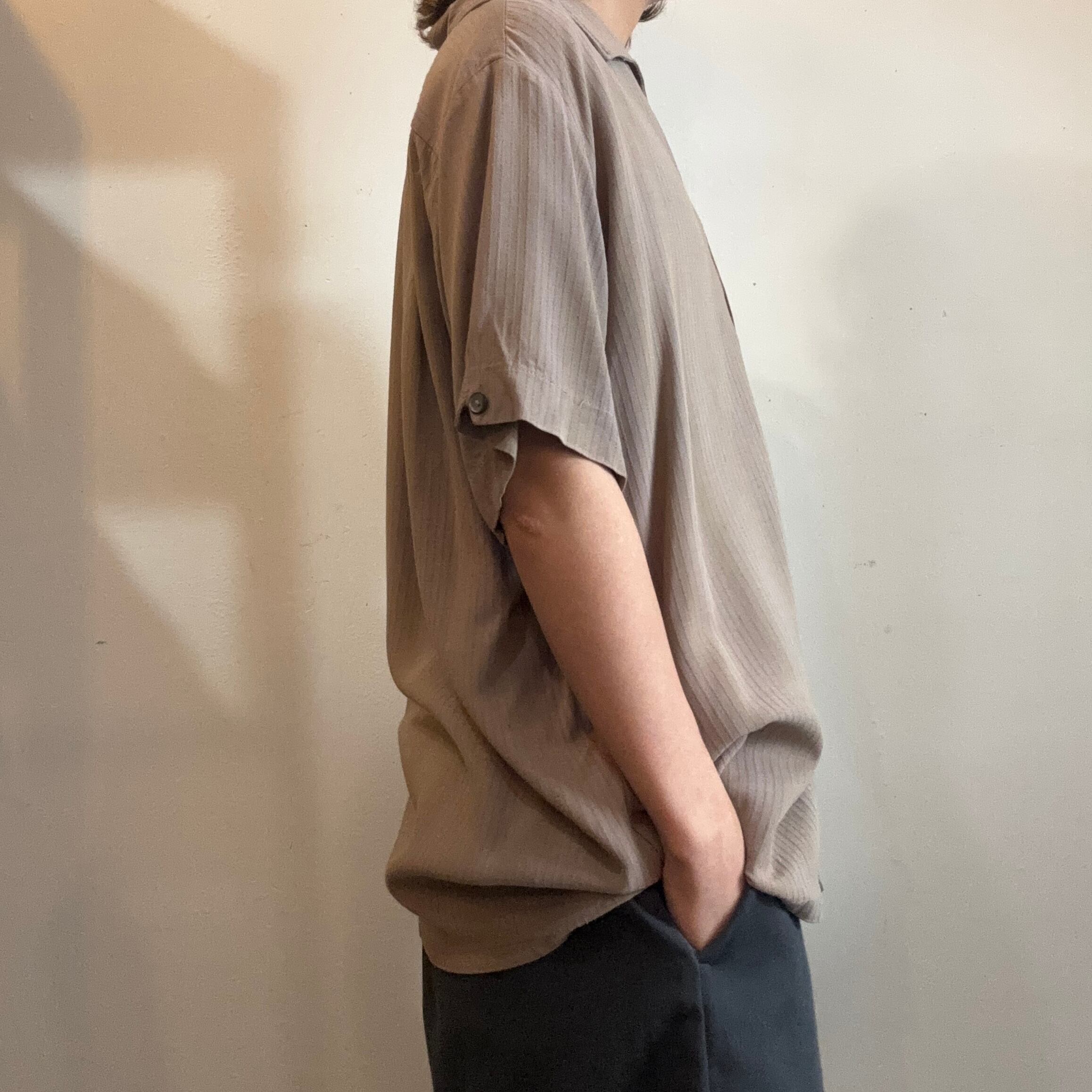 落ち感と光沢感が特徴的なウォッシャブルレーヨン生地を使用しており、当時らしい柔らかな着心地が魅力です。織のストライプと、細ピッチのシャドーストライプが品のある印象を与え、カジュアルからドレス寄りまで幅広く活躍します。