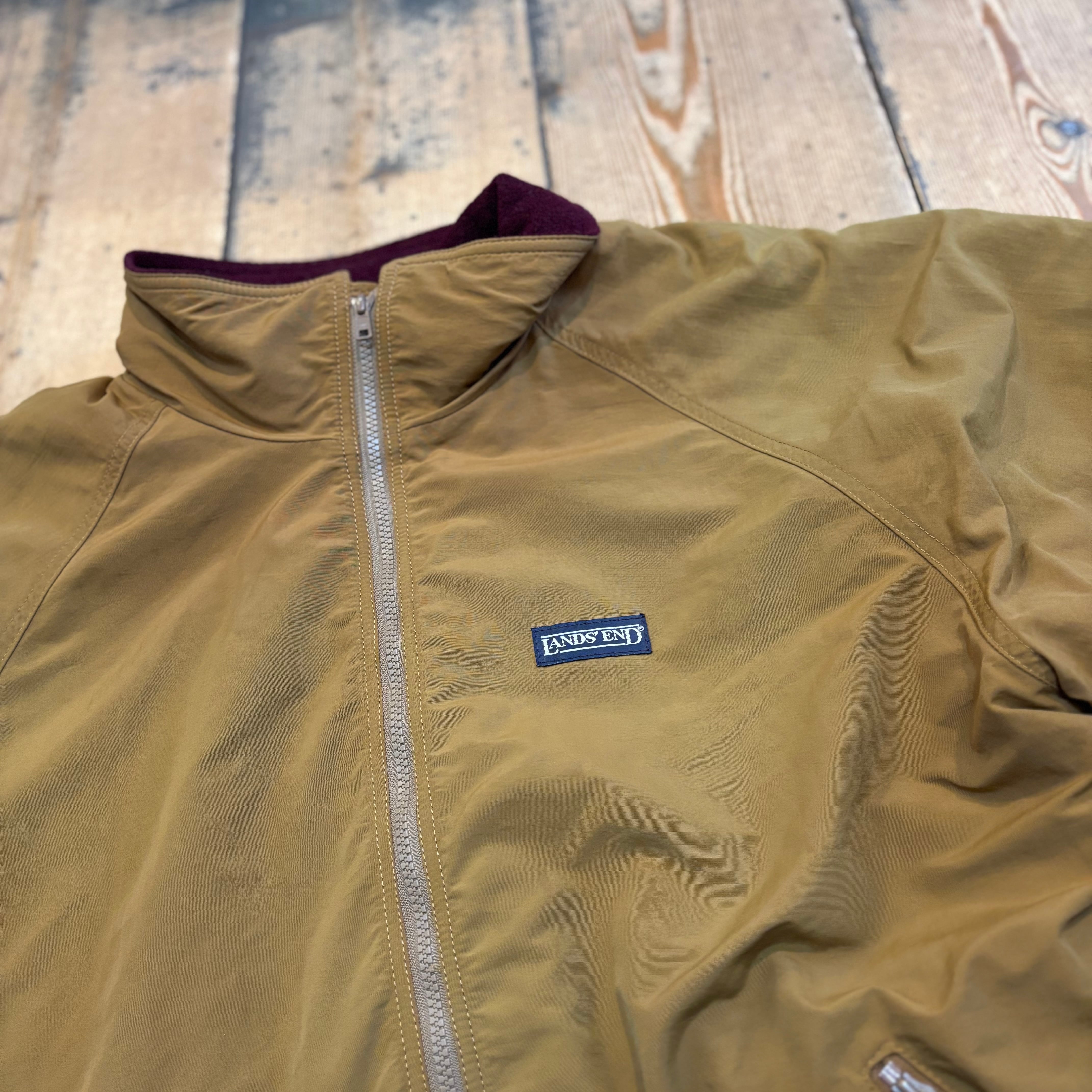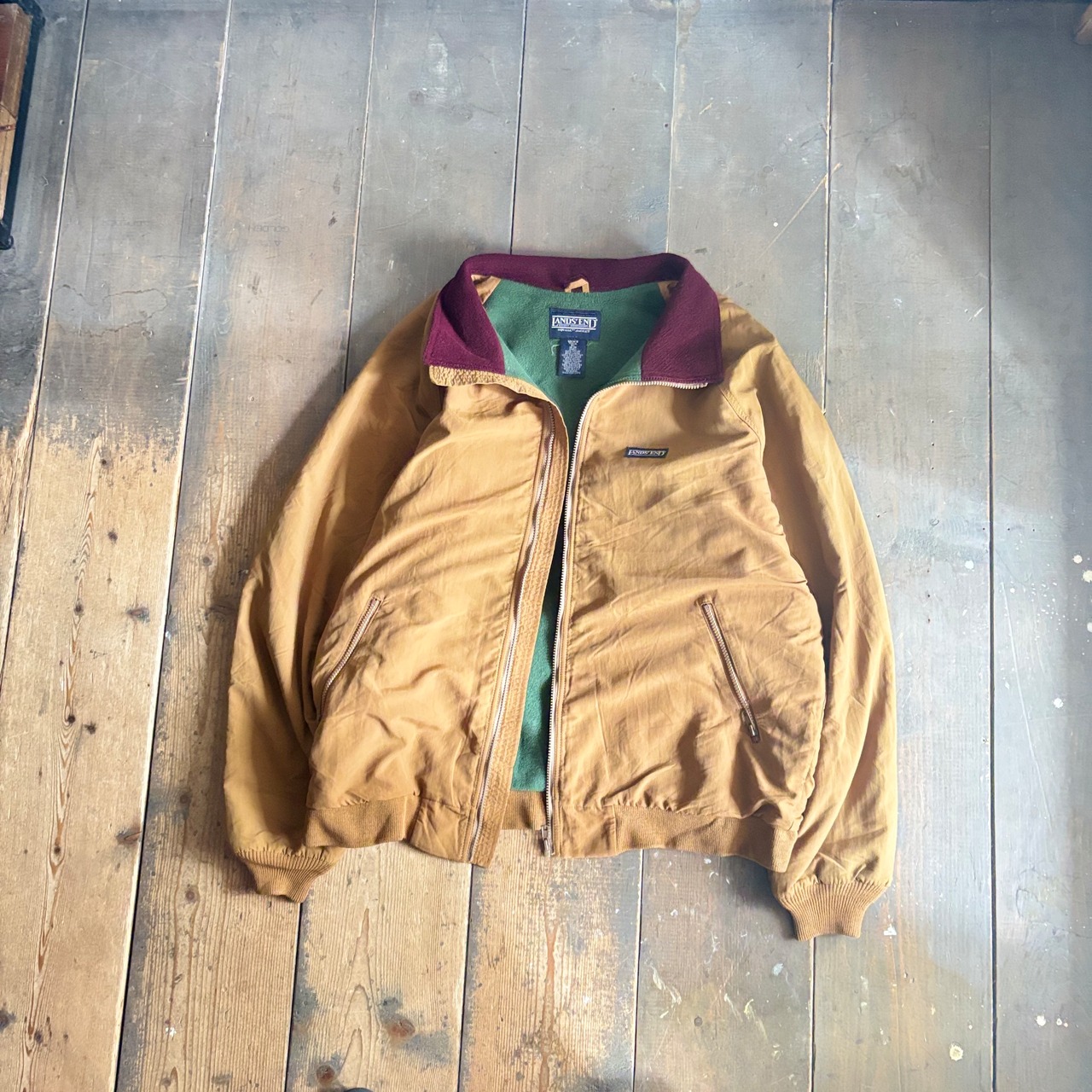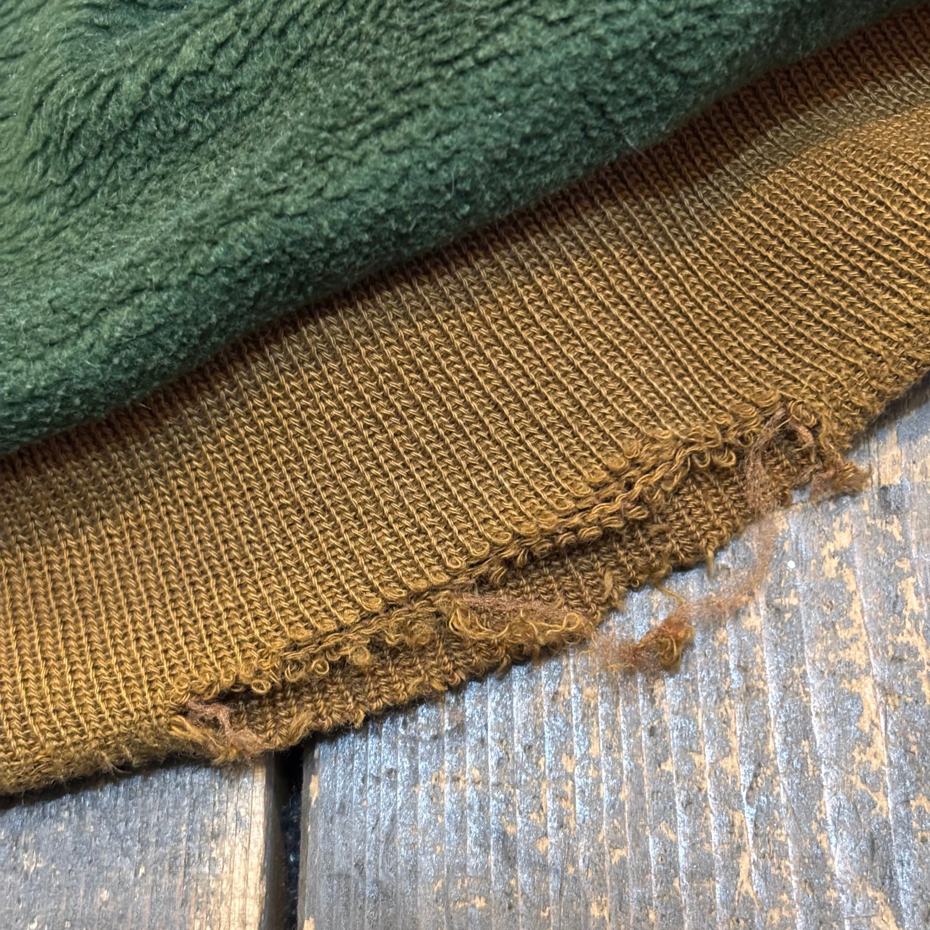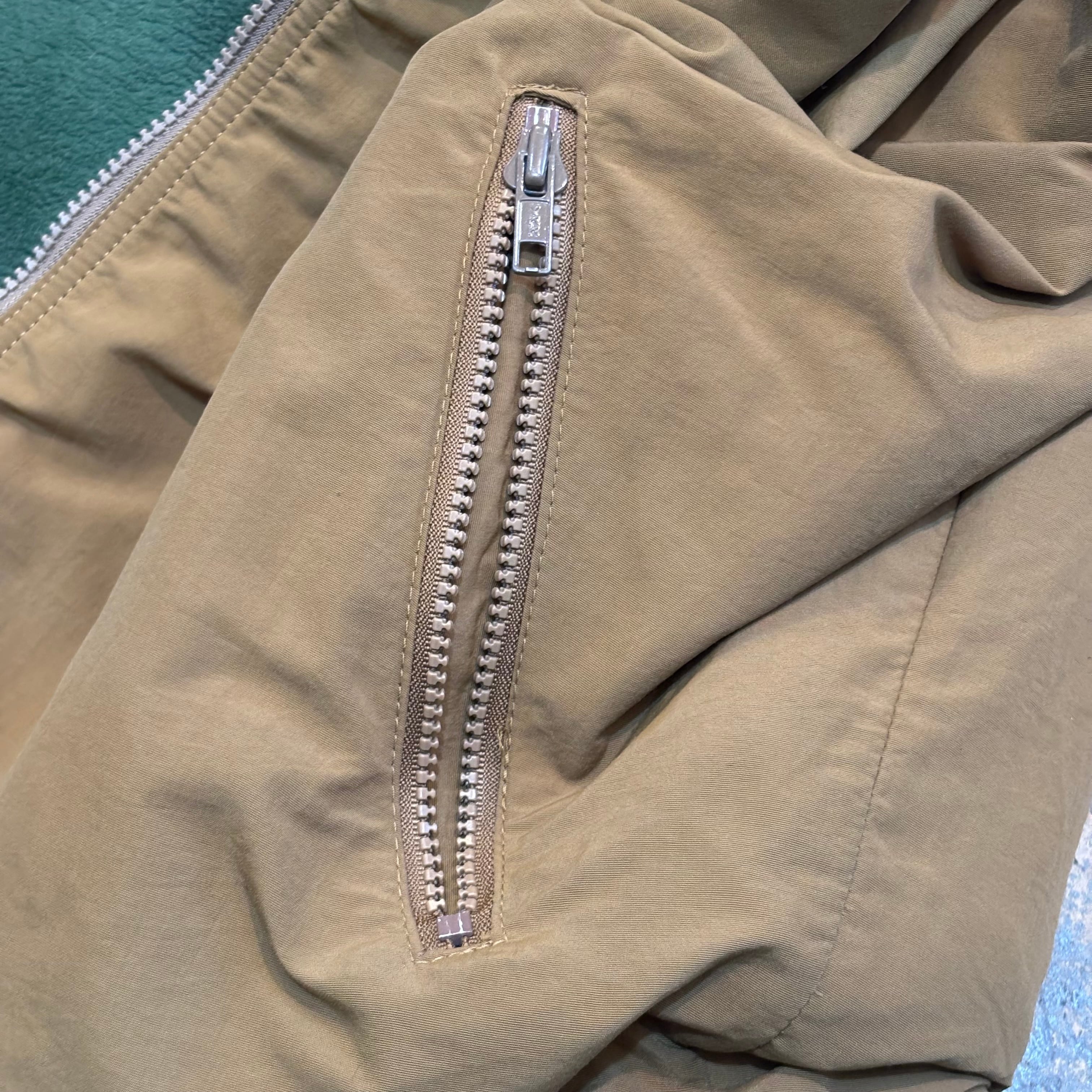 カーキのボディに襟裏バーガンディ、グリーンのフリース、