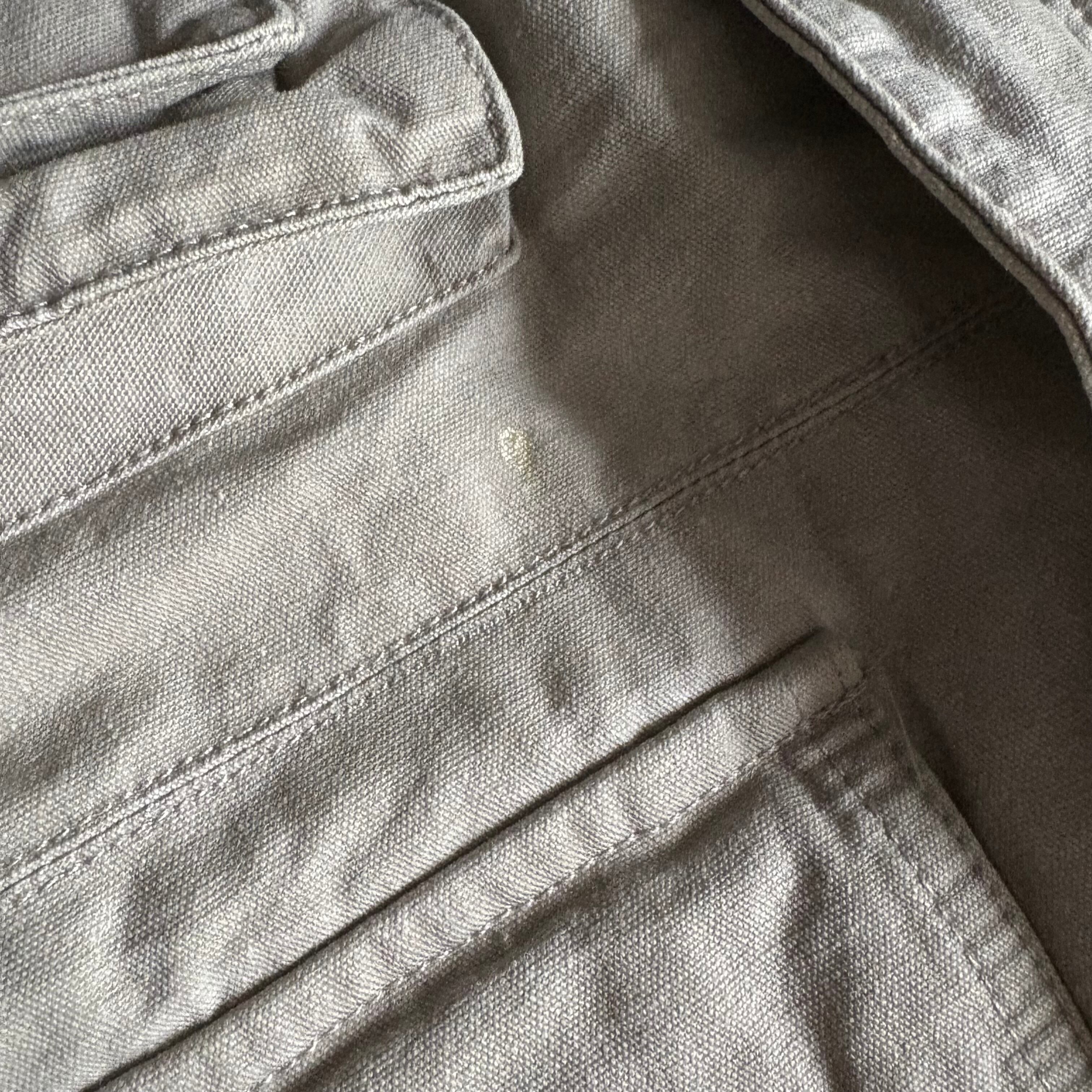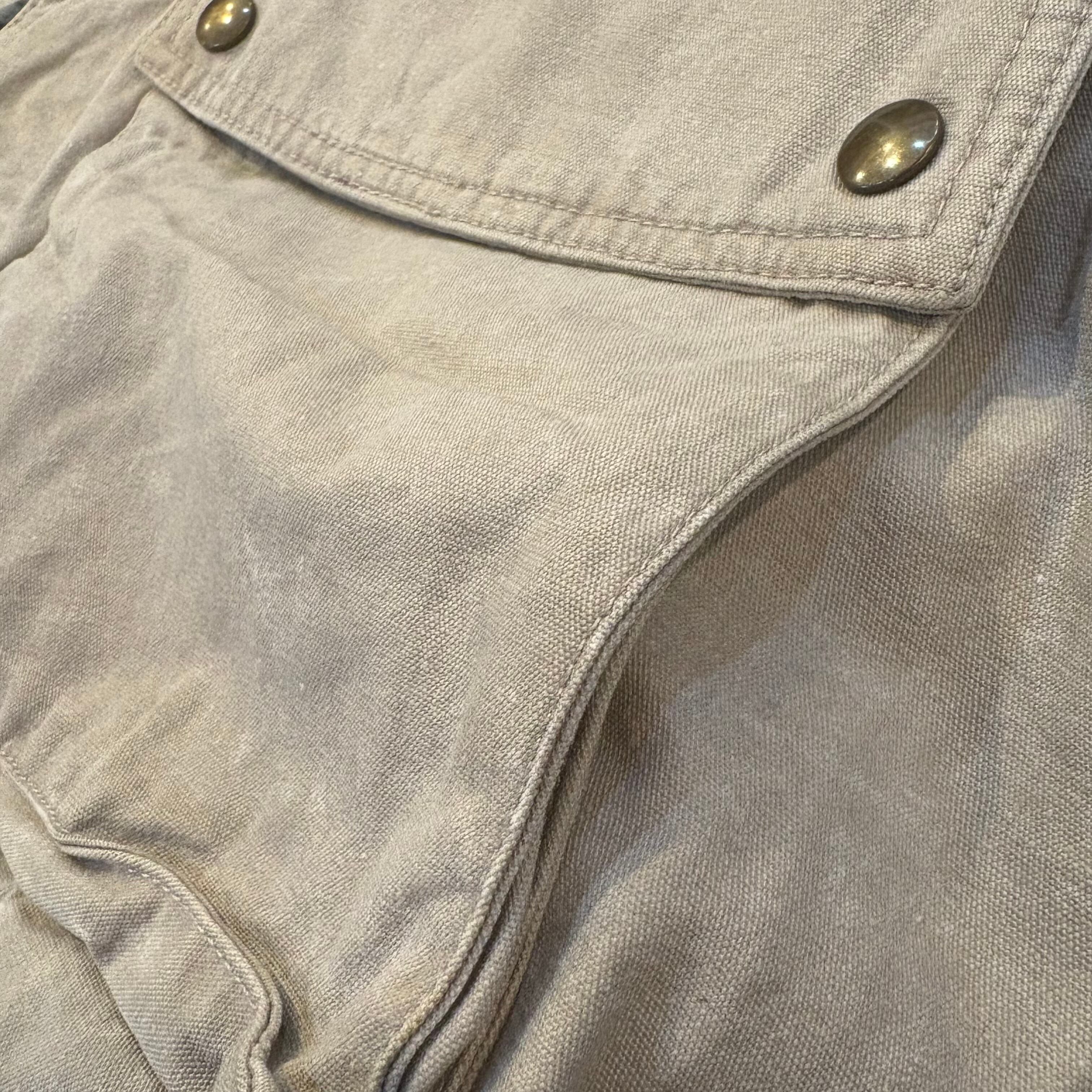 前右身ごろのポケットの下に接着剤のような汚れあり。他は大きな目立つ汚れはありませんが、ヴィンテージ・古着にご理解のある方におすすめいたします。