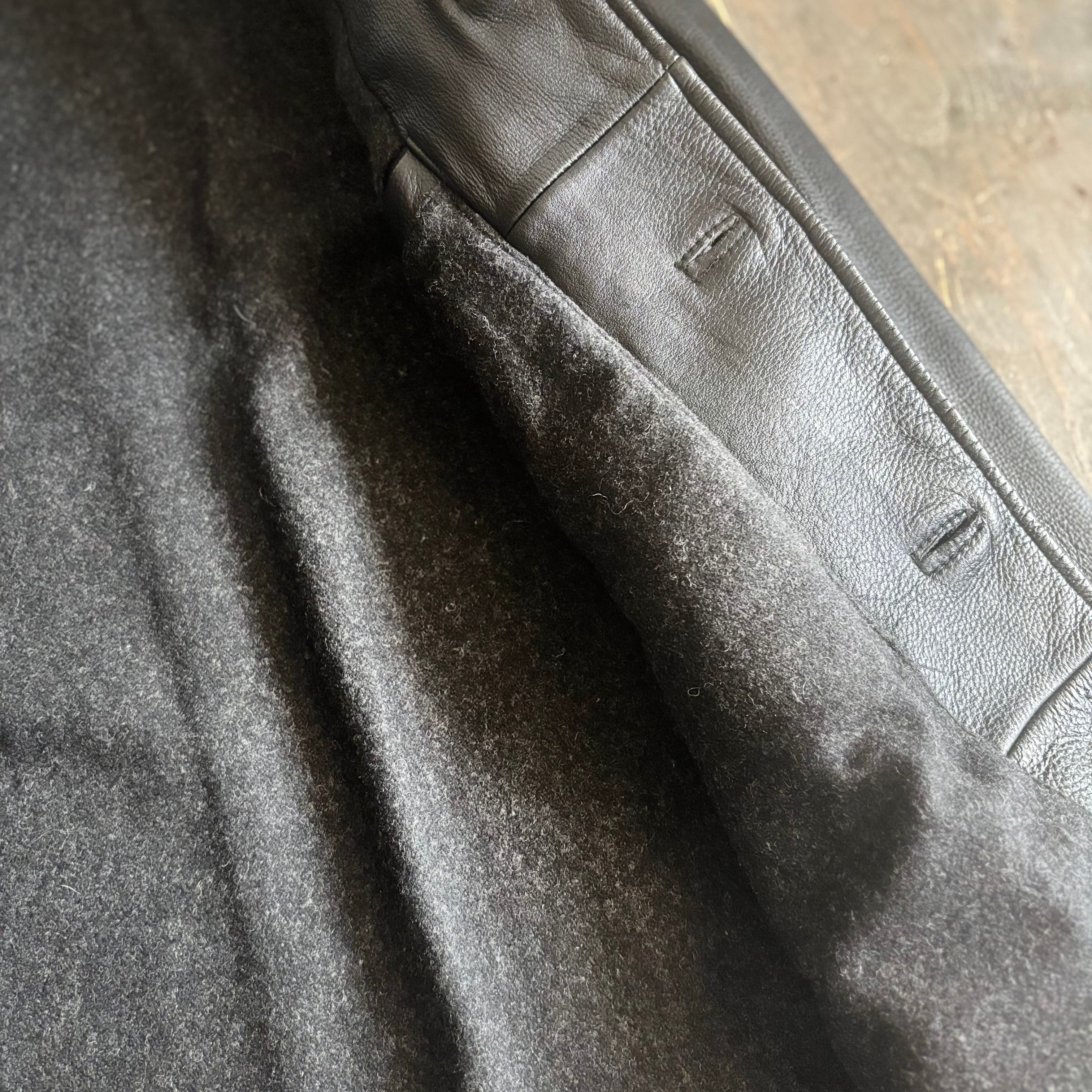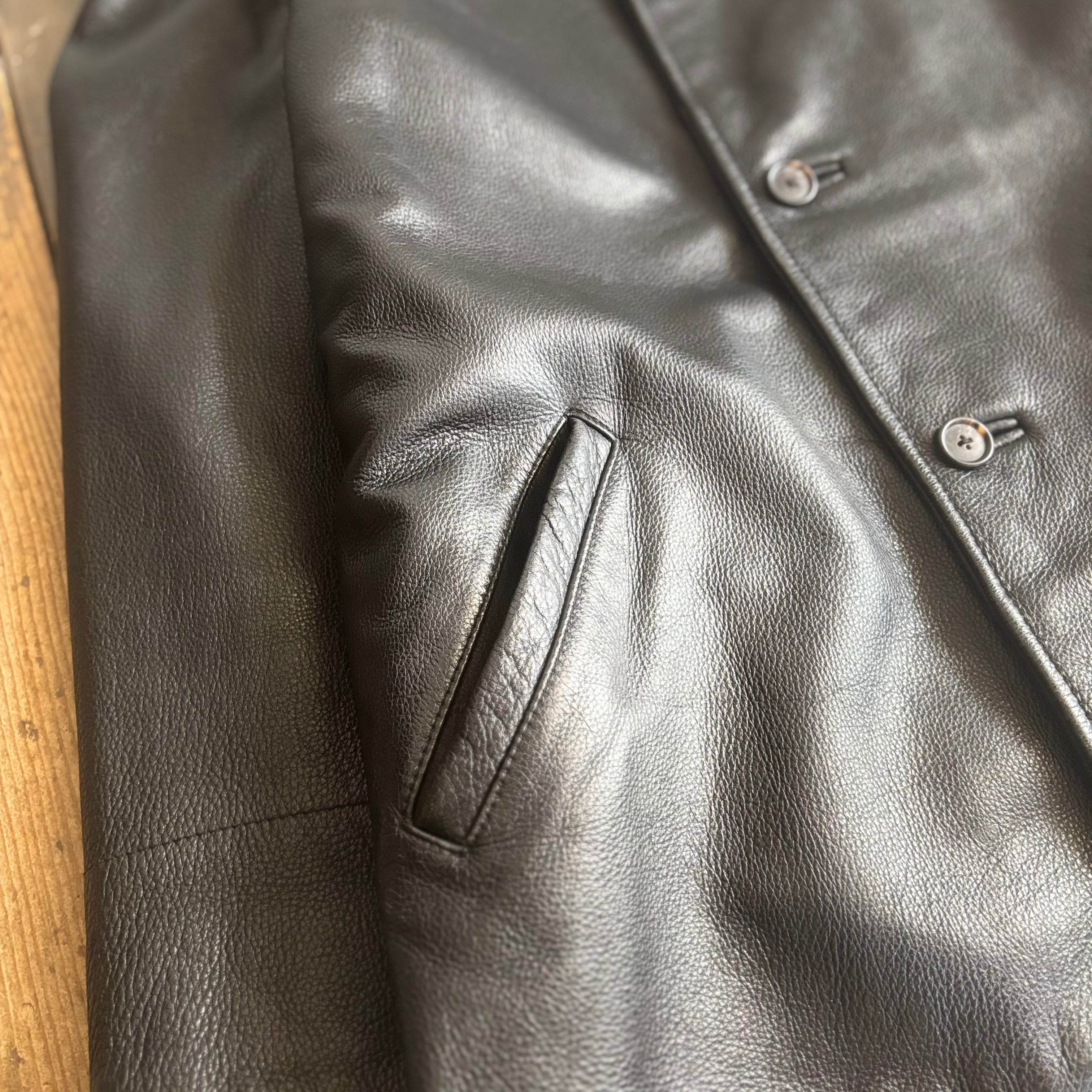 本家Pコートはウール製だったり、ダブル仕様だったりするのでカジュアルな雰囲気で丸っこい印象ですが、上質なレザーを使っているので、かなりバチっとカッコいい一着に仕上がってます。