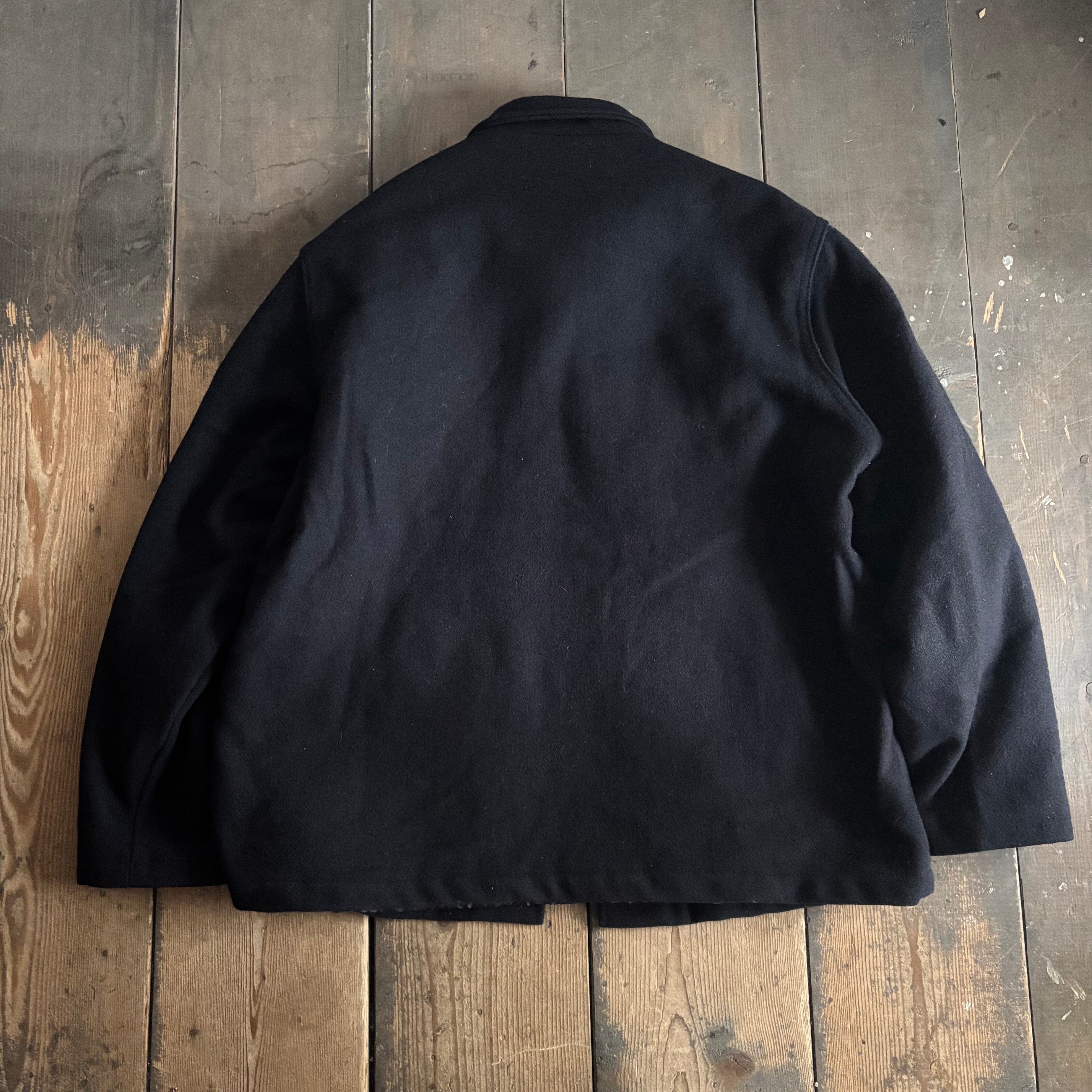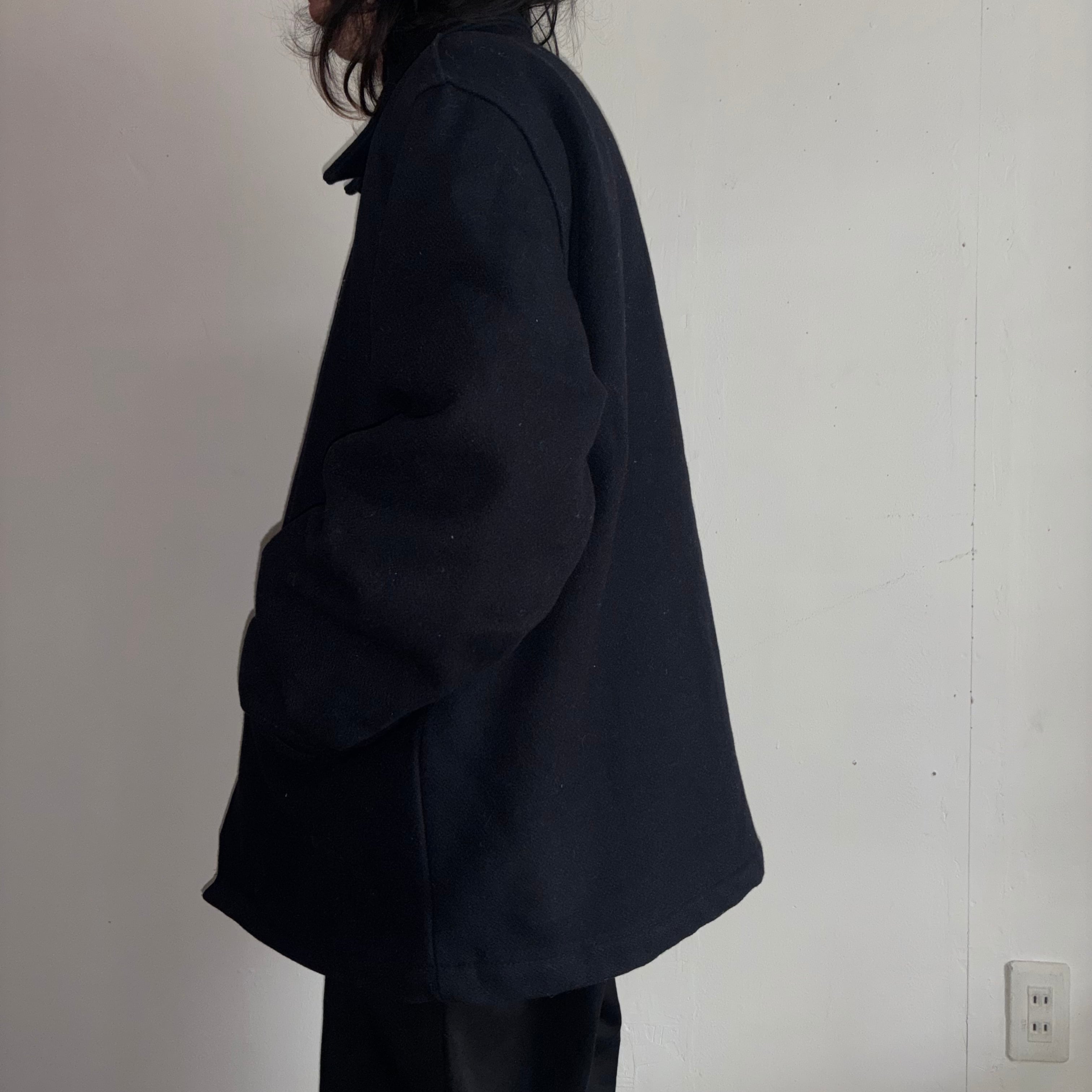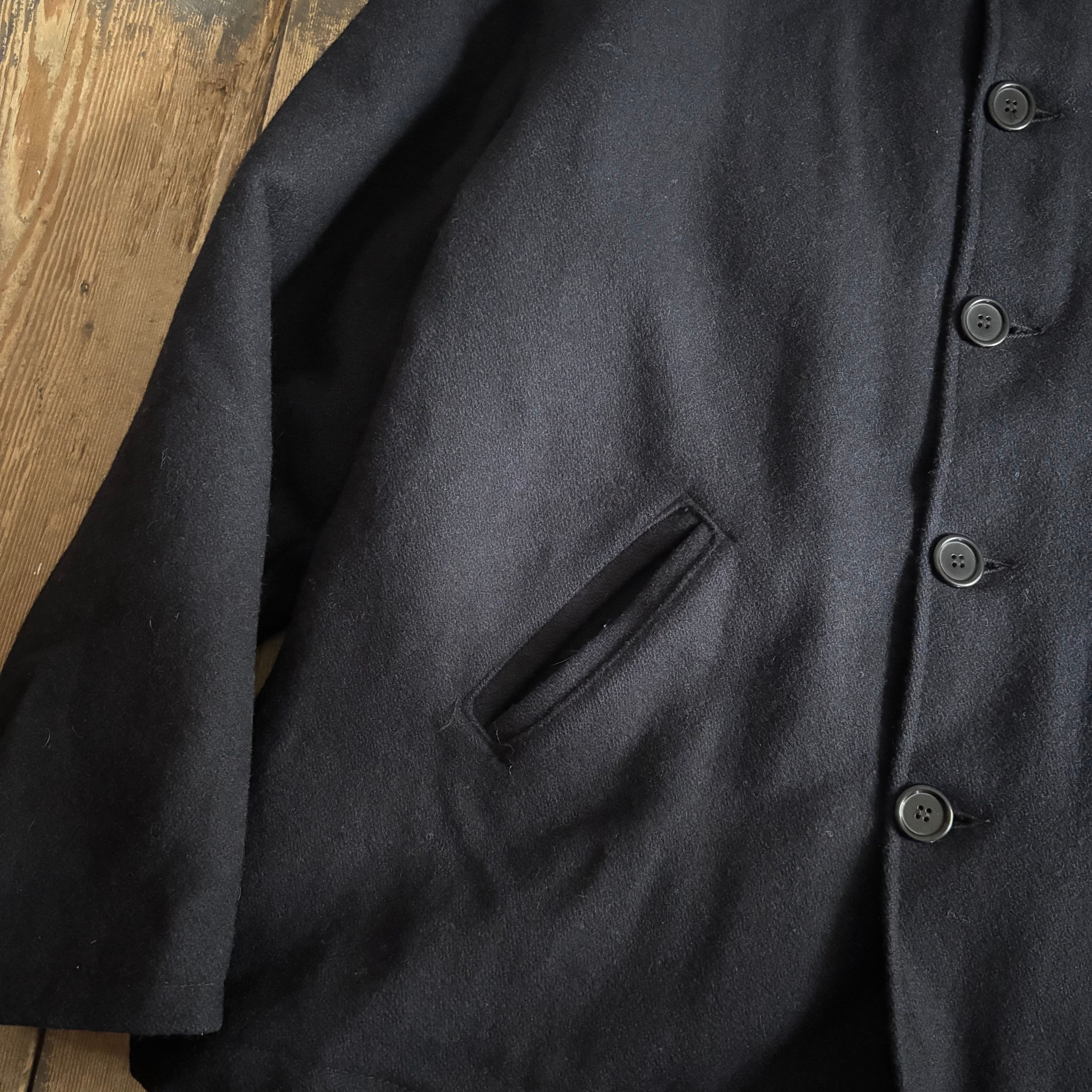 こちらはオールメルトン(ウール)生地のロングタイプで、通常のコート等に使われるようなボタンがついて、ブラックカラーの珍しい個体です。