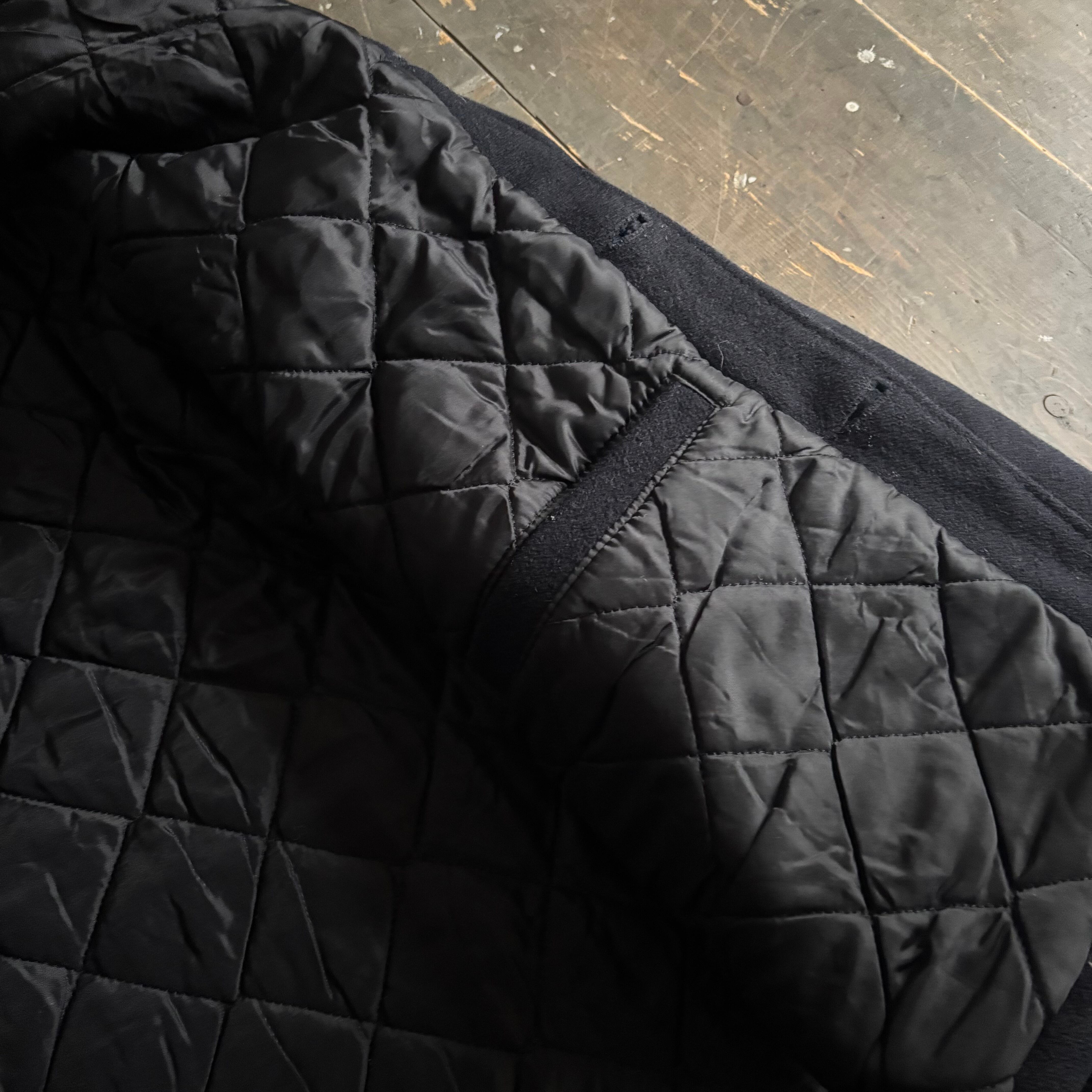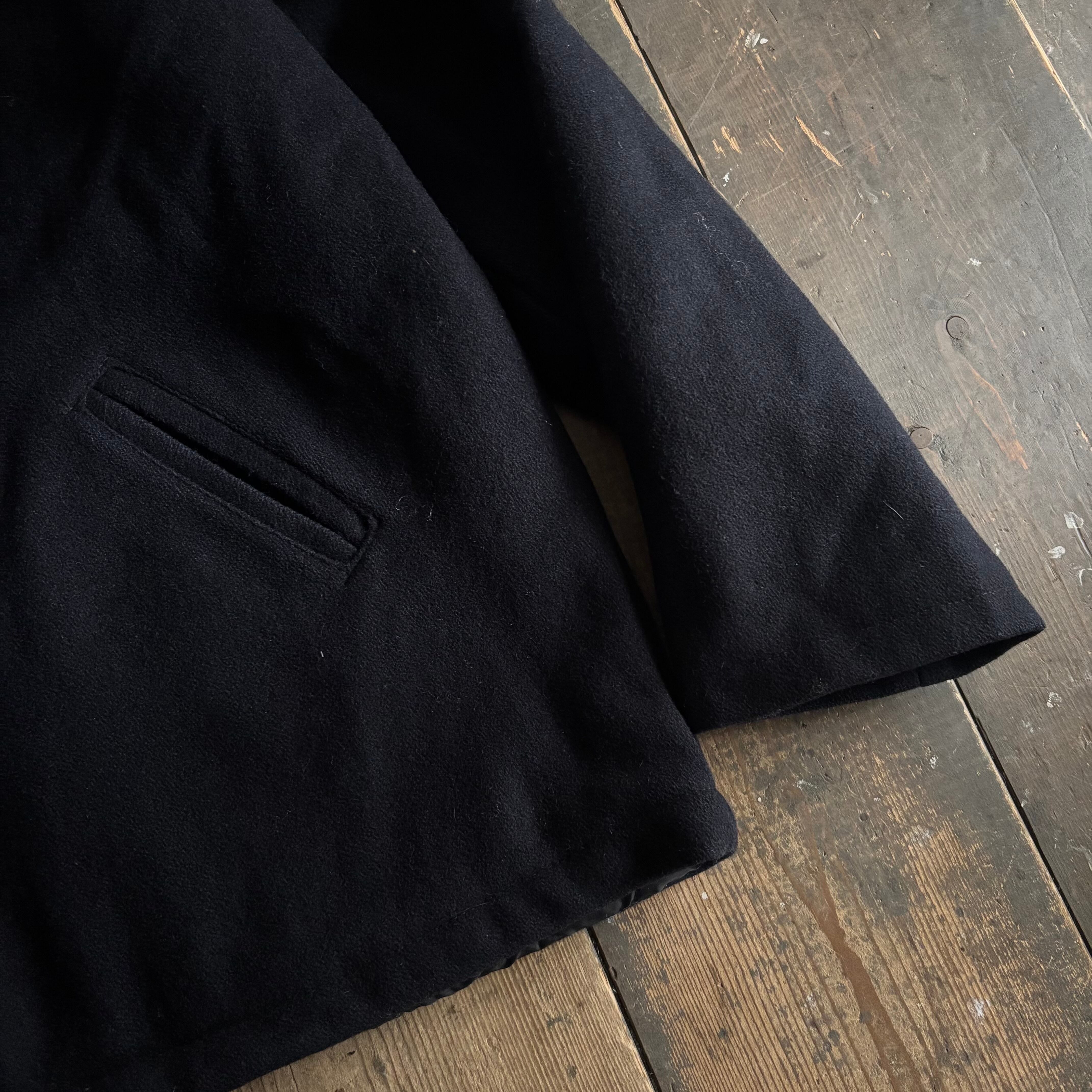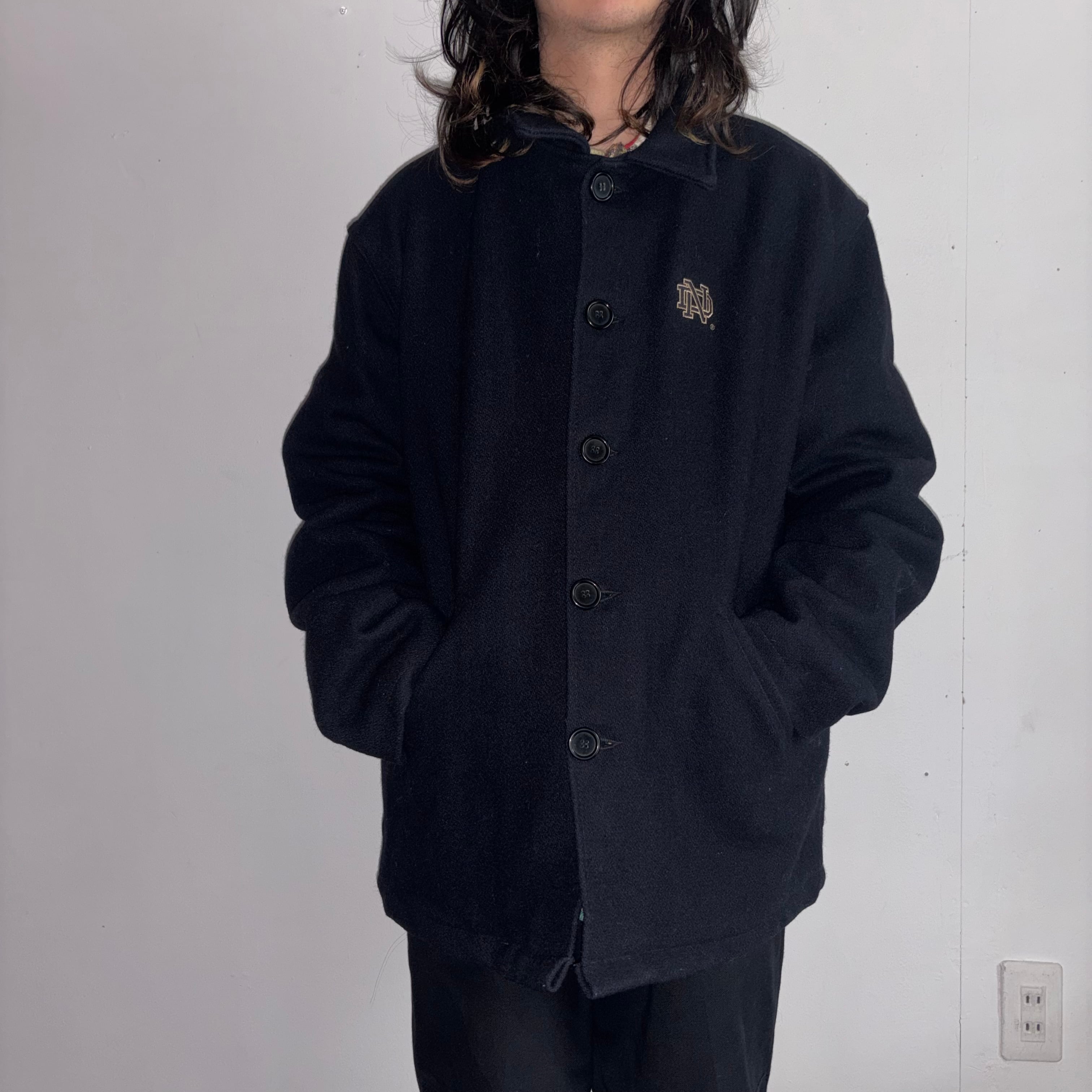 こちらはオールメルトン(ウール)生地のロングタイプで、通常のコート等に使われるようなボタンがついて、ブラックカラーの珍しい個体です。