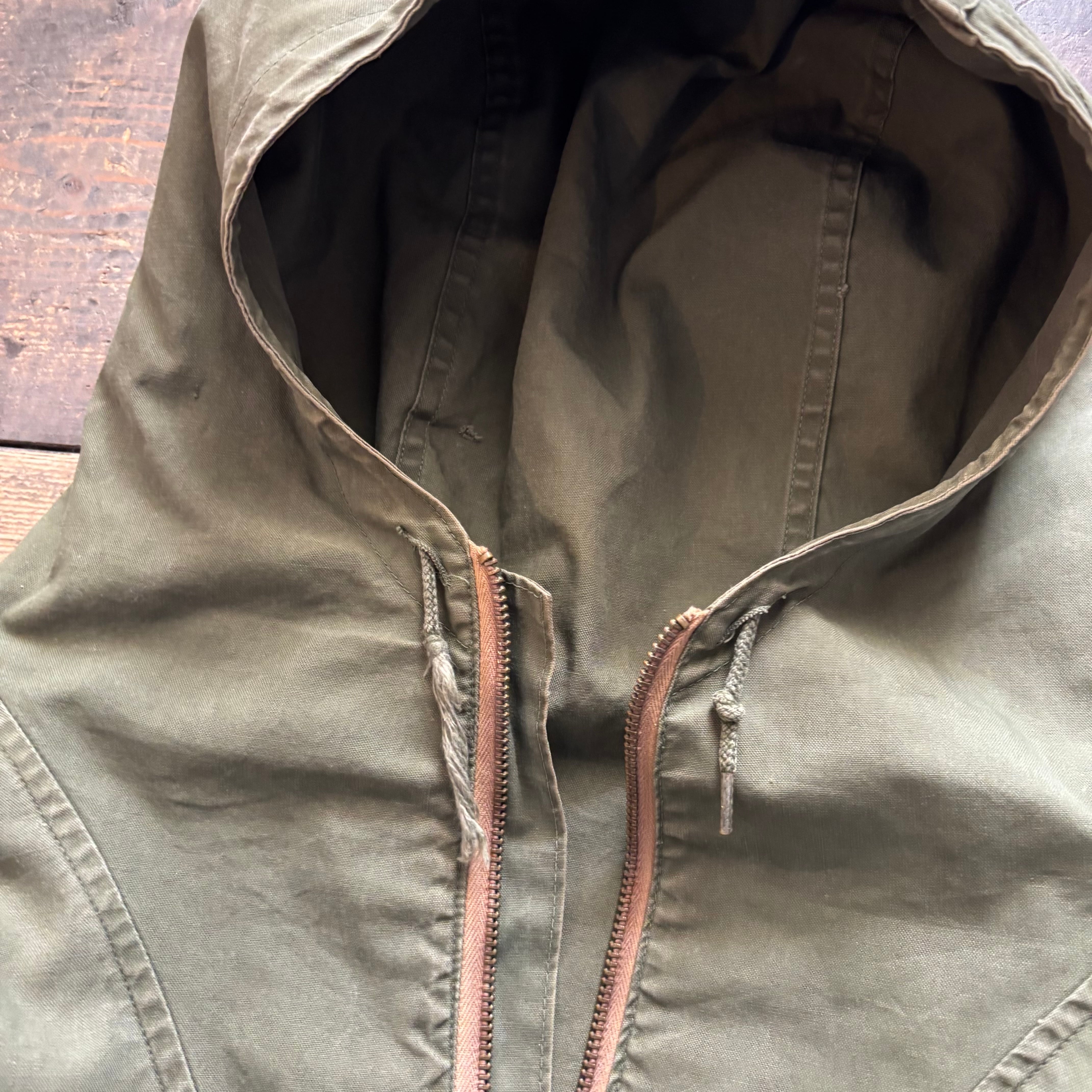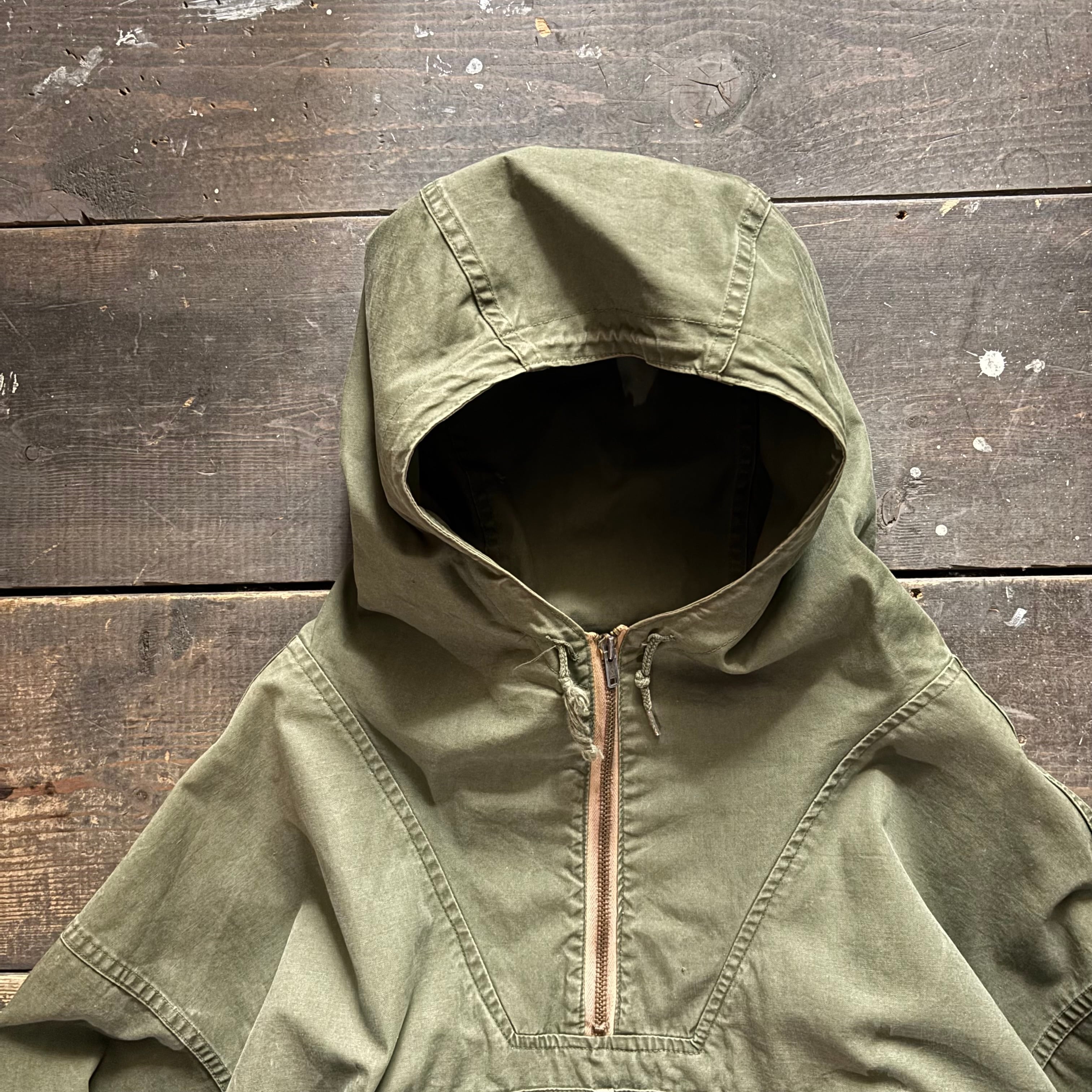 ハーフジップのプルオーバーで大型フロントポケット、フード一体型構造など、随所に軍由来のディティールが残ってます。